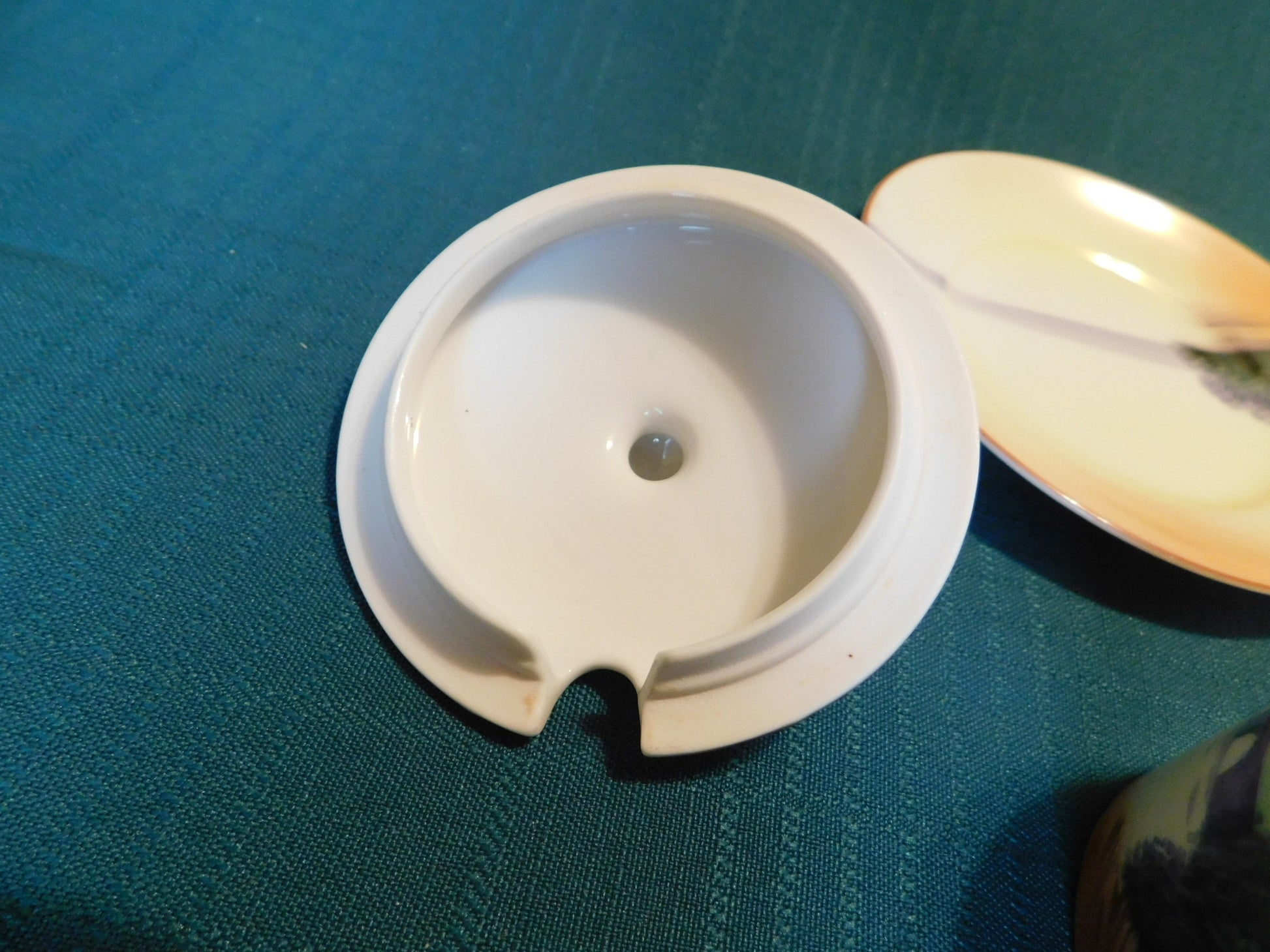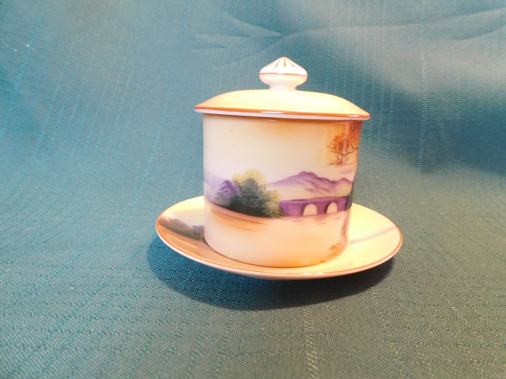 Antique Noritake M (1911) bridge scene lidded condiment jar with underplate VGU